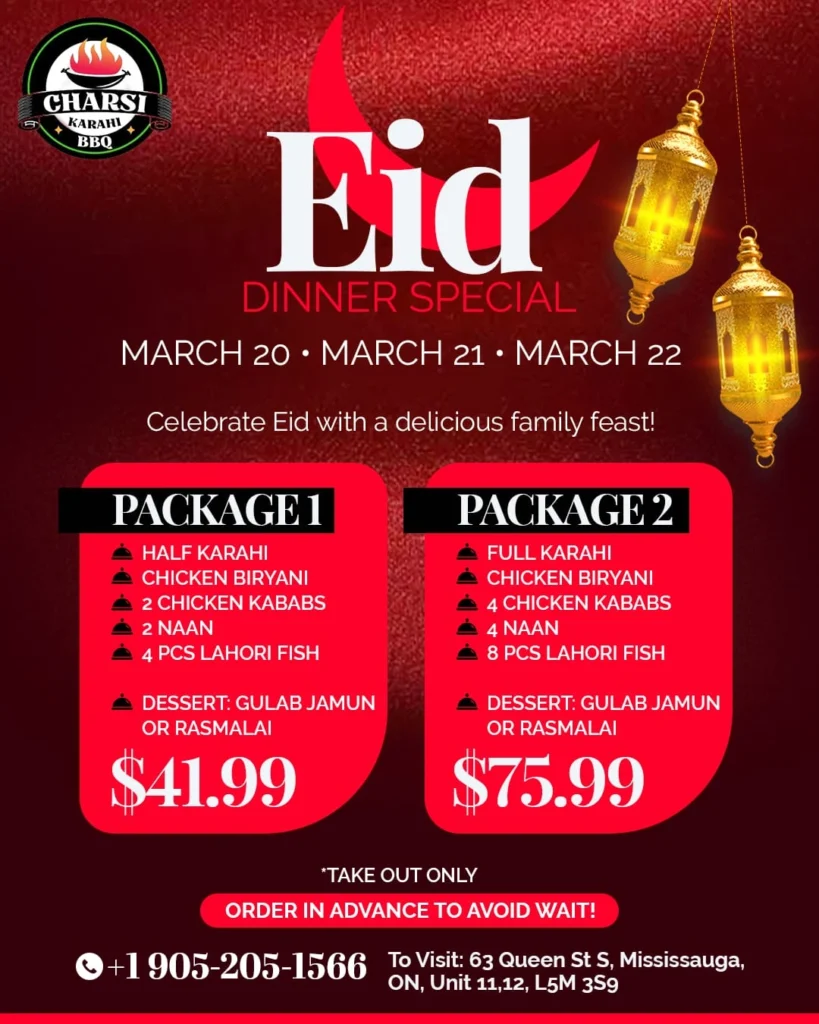From a flavorful Eid buffet 2026 to convenient Eid catering options, this is your go-to destination for authentic Pakistani cuisine in Mississauga. Make this Eid special and celebrate with delicious food, family, and tradition.